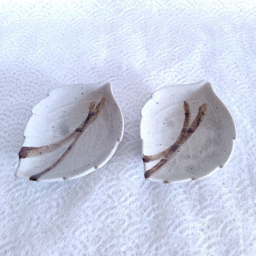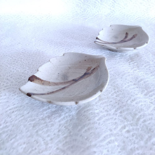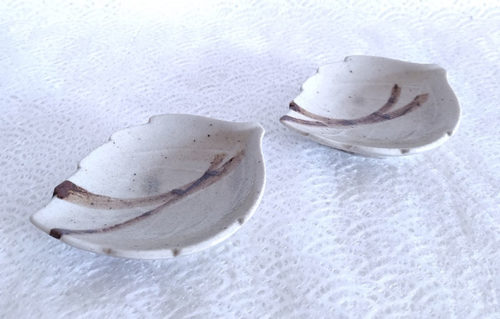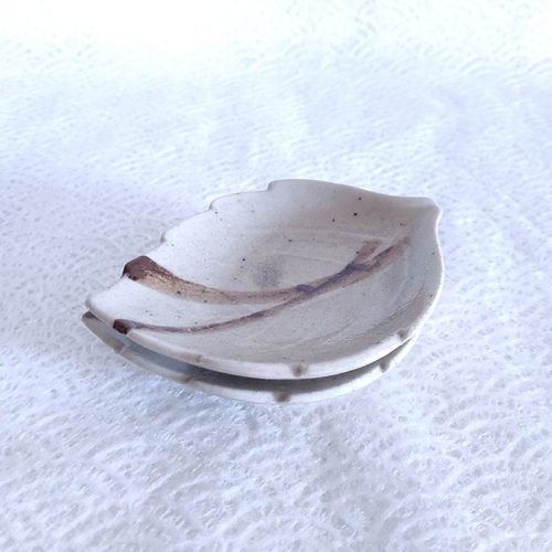 This sauce dish has a shape of a leaf in a greyish beige colour.