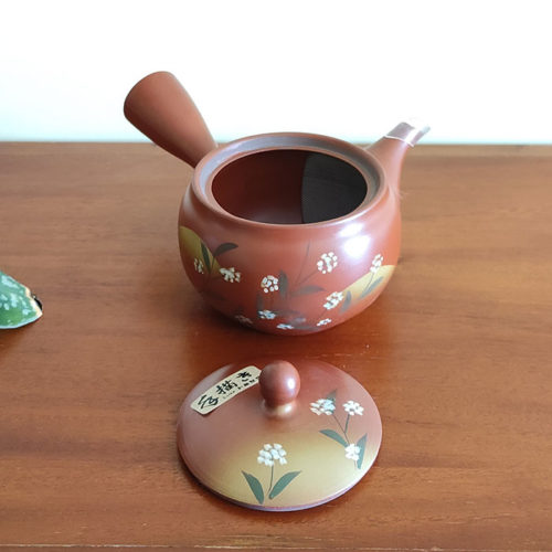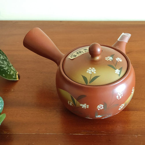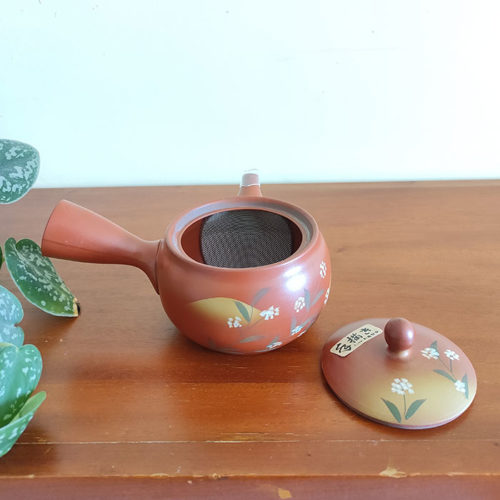 Tokoname’s red (vermilion) clay is used in this teapot and flowers called ‘かすみ草 Kasumiso‘ are hand painted.