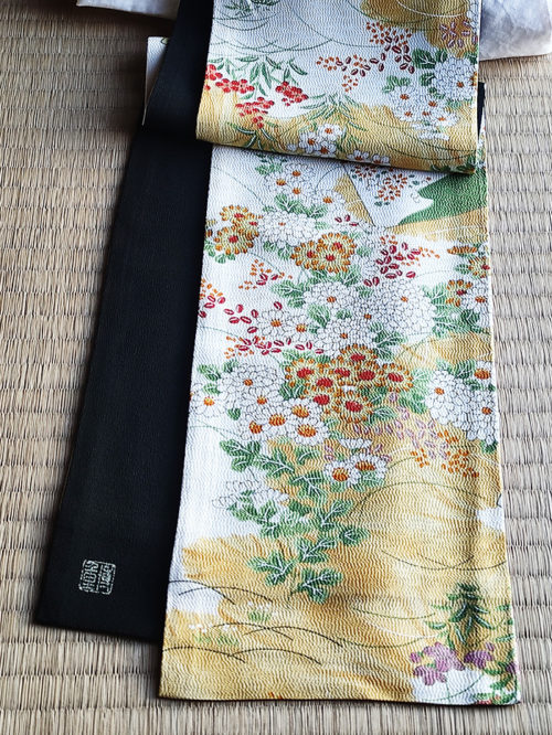 The colour is yellow with a pattern of chrysanthemum and the back side is black.