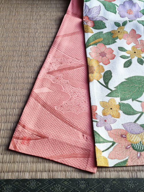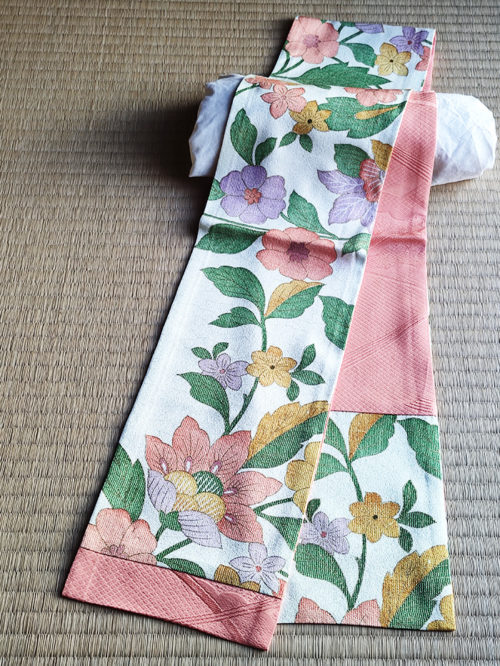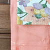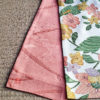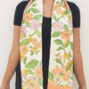 This scarf has a cream colour featuring a pattern of large flowers in different colours and the back side has a beautiful coral colour with a woven pattern.