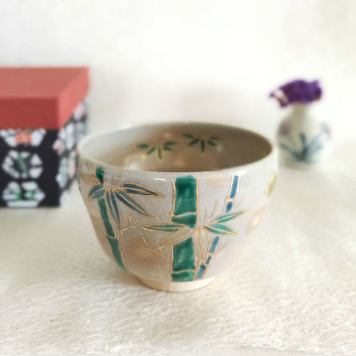 This Matcha bowl features beautifully hand-painted bamboo trees. The bright green colour of bamboo is traced with gold on the beige bowl.
