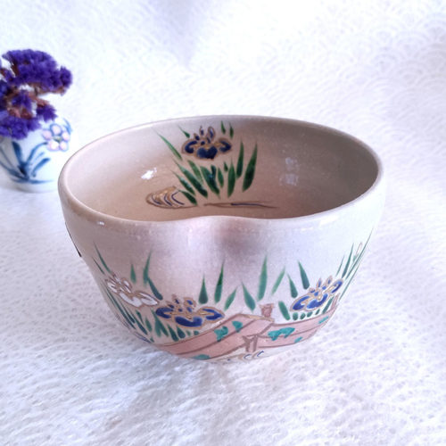Japanese iris which are growing in the water is captured and hand-painted in this Matcha bowl beautifully.