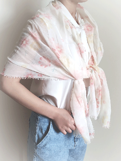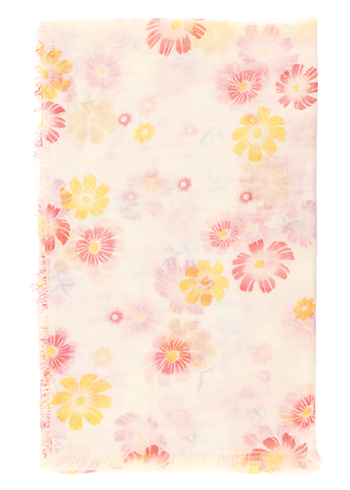 The scarf showcases a captivating array of cosmos flowers, varying in size, rendered in vibrant shades of coral and yellow, complemented by lush green foliage.