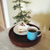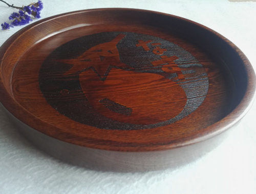 Wooden tray with a print of Nasu (Eggplant). The writing next to the eggplant is written in Japanese Hiragana Na-Su.