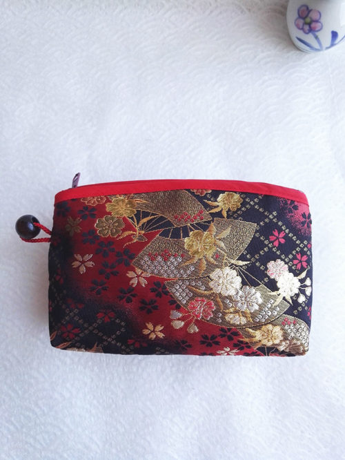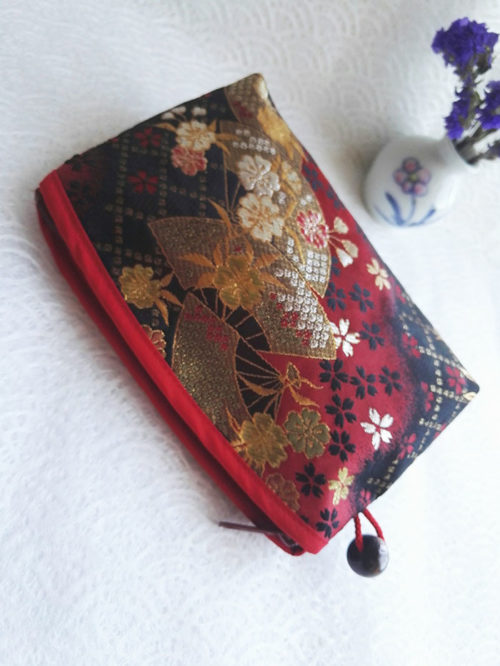 Base color is red with a pattern of fans and Sakura flowers in gold
