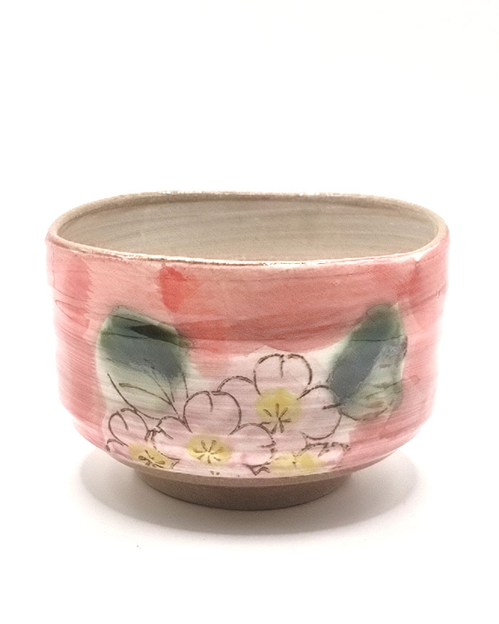 This elegant Mino ware Matcha bowl features a classic half-cylinder shape with a gently curved rim and hand-painted sakura blossoms in soft pink, green, and yellow hues. The interior has a delicate swirl pattern in a light beige-cream tone, adding subtle charm to every angle.